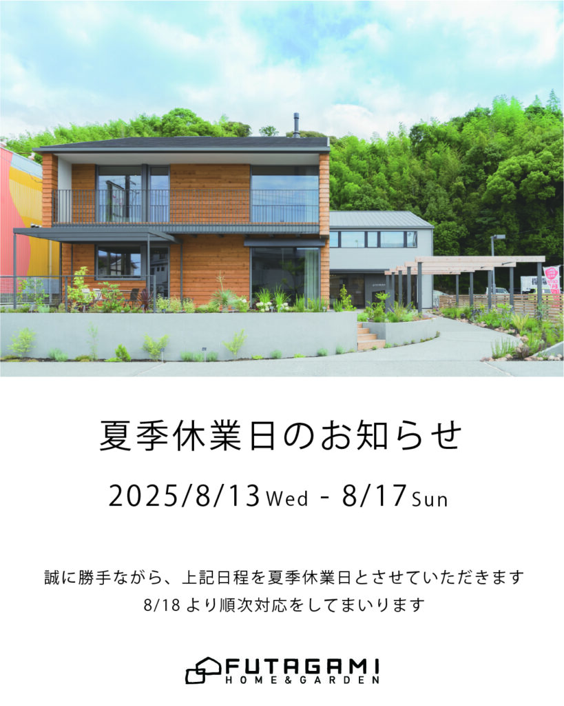 フタガミホームアンドガーデンでは、誠に勝手ながら下記のとおり夏季休業とさせていただきます。